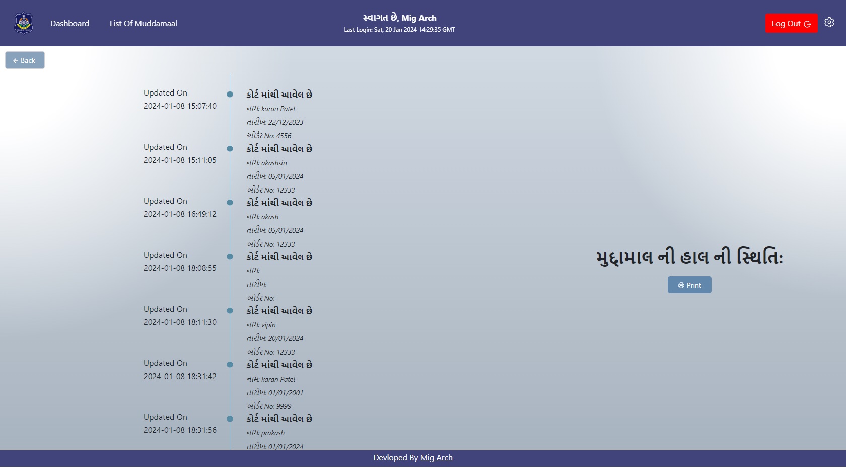 Easy to access of Custody of Muddamaal with infomration like Updated On, Updated By and Order Number.